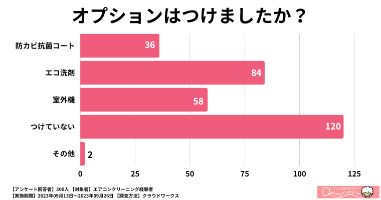 オプション利用に関してもアンケートをとったところ、最も多い120人が「オプションをつけていない」と答えています。これは、基本的なエアコンクリーニングだけで十分だと感じる人が多いことを示しています。