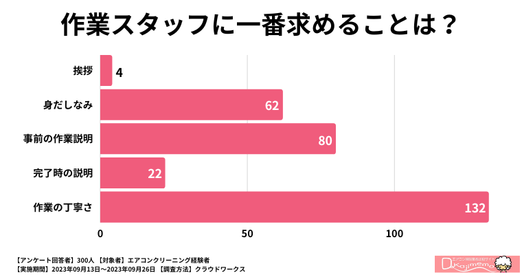 アンケートの結果を見ると、作業スタッフに対しては、最も多くの人々が「作業の丁寧さ」を求めていることが分かります。なんと132人もの方がこの項目を選んでおり、クリーニングの品質に対する強い期待が伺えます。実際、エアコンクリーニングは専門的な技術を要する作業であり、ここに手を抜かれるとメリットを感じづらくなるため、利用者のこのような意識は至極当然といえるでしょう。