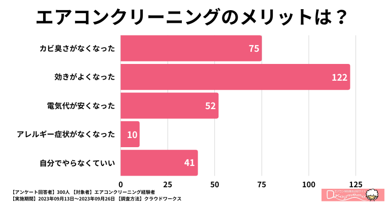 最後にエアコンクリーニングのメリットを聞いたところ、「効きがよくなった」という意見が最も多い結果となりました。なんと122人がこの項目を選択しており、クリーニングによってエアコンの冷暖房の効率が向上し、快適な室温をより早く実現できるようになったことが伺えます。