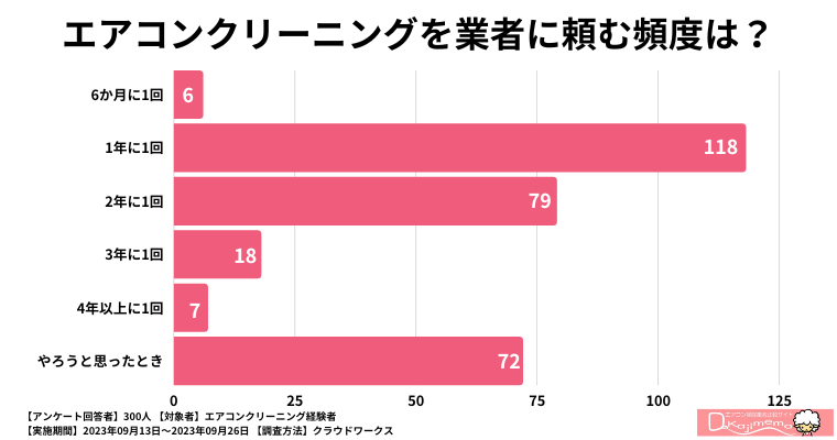 続いて、エアコンクリーニングを業者に頼む頻度に関しては、「1年に1回」と回答した方が118人と最も多く、「2年に1回」も79人と相当数いることから、大多数の方がエアコンクリーニングを1~2年に1回という高頻度で行っていることが分かります。
