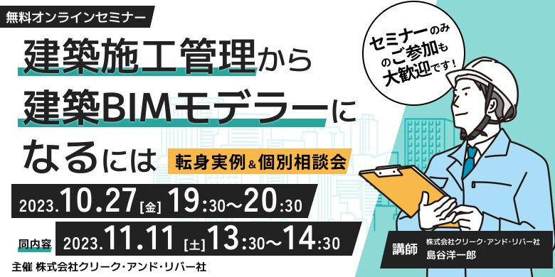 株式会社クリーク・アンド・リバー社(C&R社)は、10月27日(金)と11月11日(土)に、無料のオンラインセミナー「建築施工管理から建築BIMモデラーになるには~転身実例&希望者向け個別相談会~」を開催いたします。