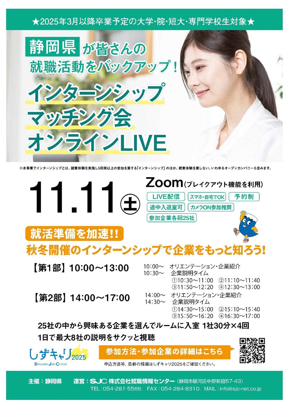 静岡県では、現在大学1~3年生の方など2025年3月以降卒業予定の学生の方を対象として、「インターンシップマッチング会 オンラインLIVE」を開催します。
