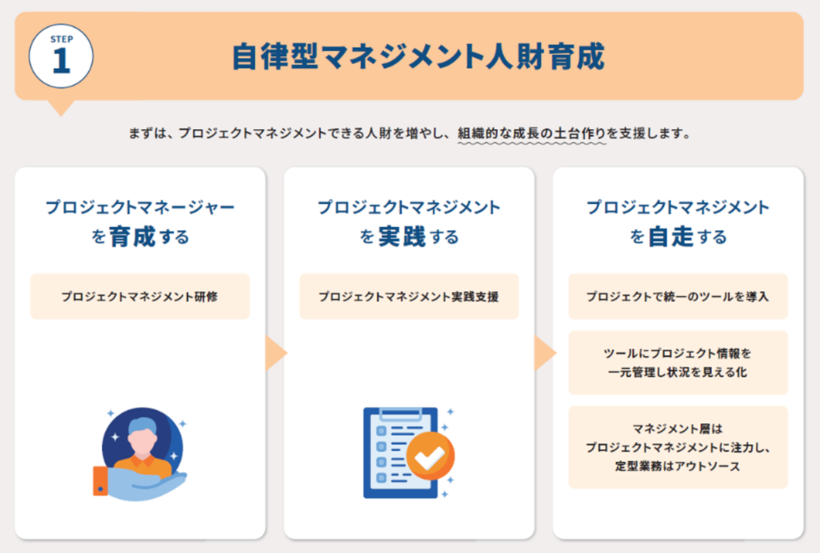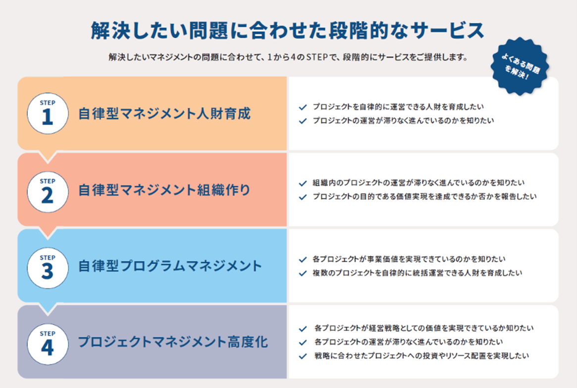 お客様の組織のマネジメント課題に合わせ、プロジェクトマネジメント支援、研修、ツールを組み合わせたパターンで組織が自律できる仕組みをご提案します。