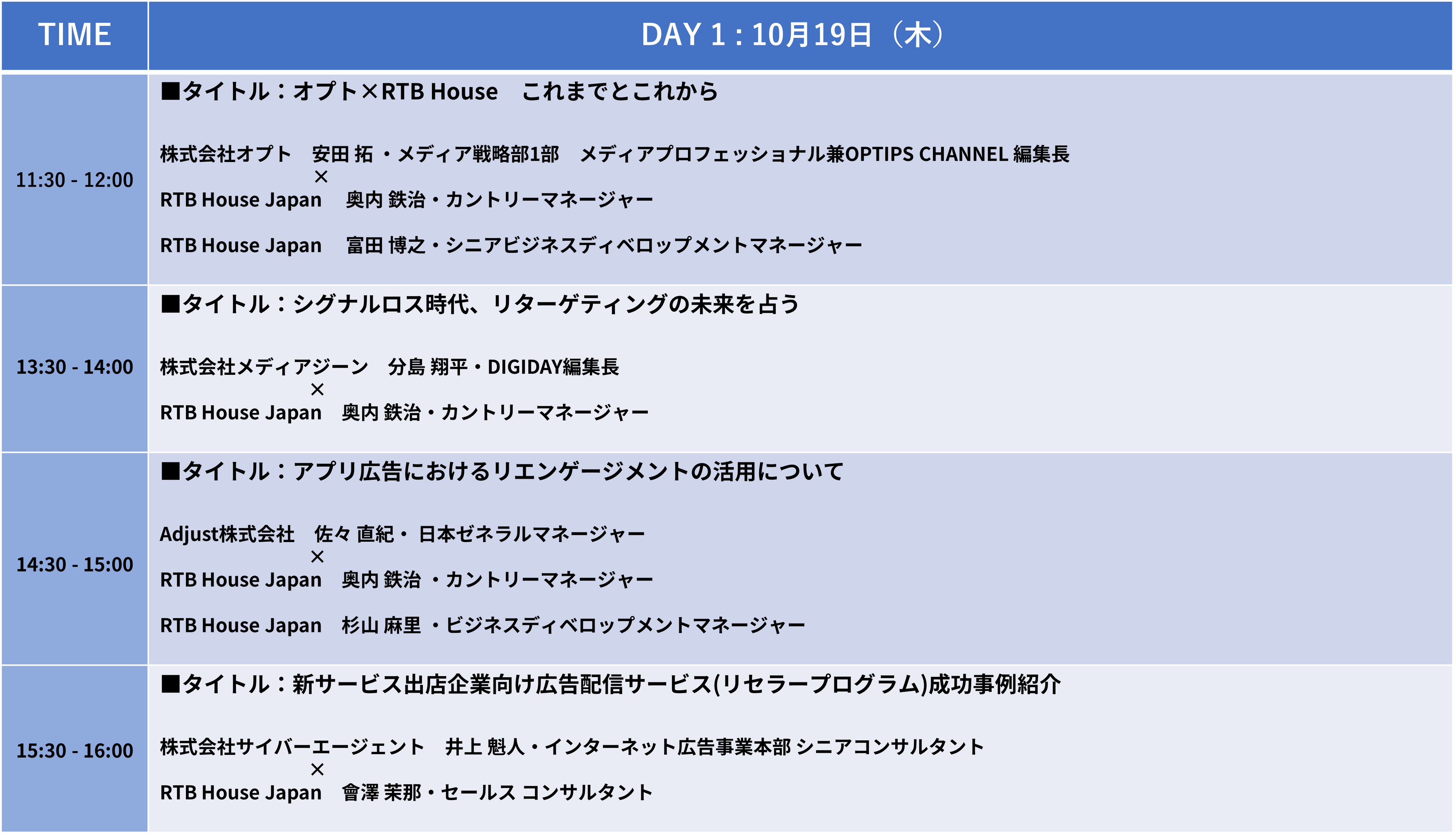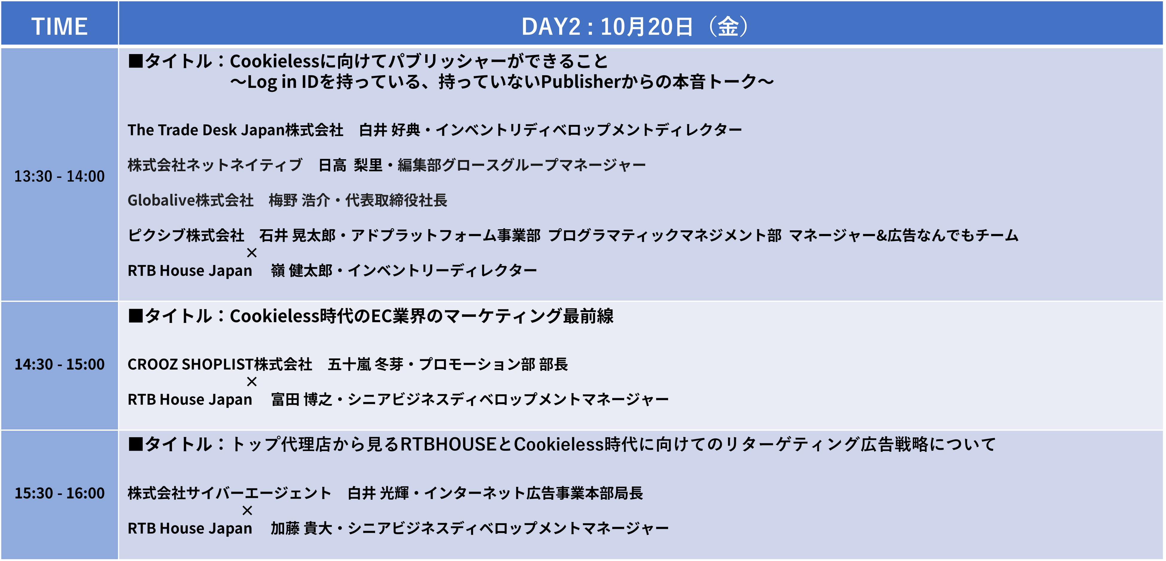 Googleのサードパーティクッキーの廃止が来年に迫るなか、RTB Houseはad:tech tokyo 2023のブース(A-20)にて、「クッキーレス」をテーマに様々なジャンルのお客様やパートナーなどとトークセッションを開催します。トークセッションには、DIGIDAY[日本版]編集長の分島翔平氏、Adjust株式会社で日本ゼネラルマネージャーを務める佐々直紀氏、CROOZ SHOPLIST株式会社でプロモーション部長を務める五十嵐冬芽氏などデジタルマーケティング分野のエキスパートの方々が登壇し、広告主や媒体者、広告代理店などそれぞれの立場での取り組みを紹介。タイムスケジュールは下記の通りです。
