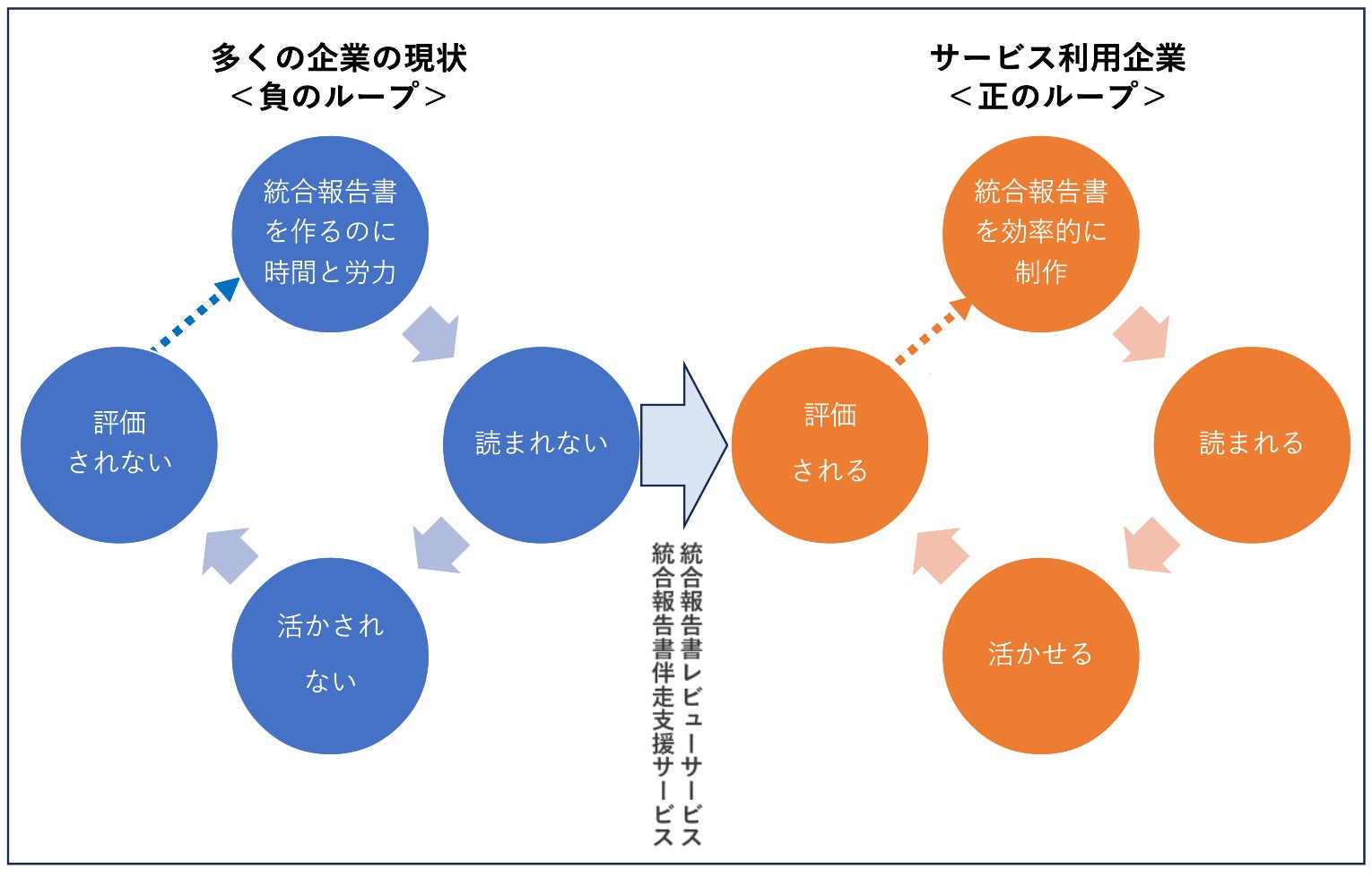 多くの統合報告書発行企業で、せっかく苦労して時間と労力をかけても、読まれない、活かせない、評価されないという悪循環に陥っている企業が圧倒的に多いのが現状です。どうすれば、統合報告書を読まれ、活かせる、評価される好循環を作ることができるのか? このような問題意識の会社様は以下のご相談ください。