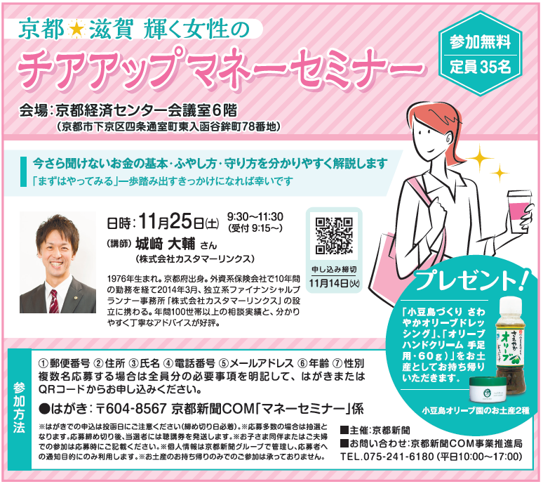 11月25日(土)京都経済センター会議室で、京都新聞主催の女性のマネーセミナーを開催します。
