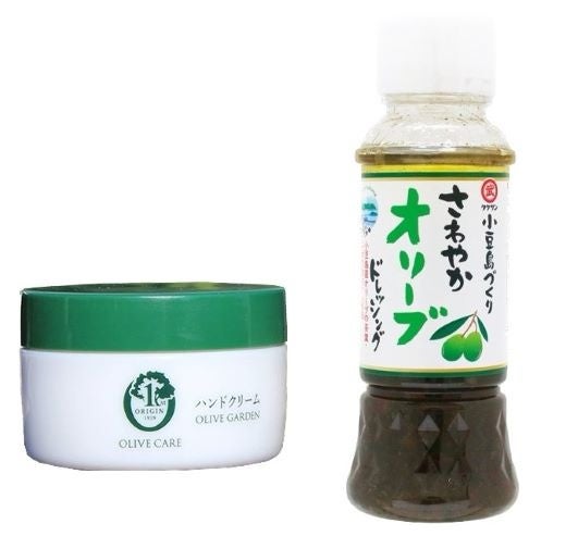▲ (左)オリーブハンドクリーム 手足用・60g ▲(右)小豆島づくり さわやかオリーブドレッシング