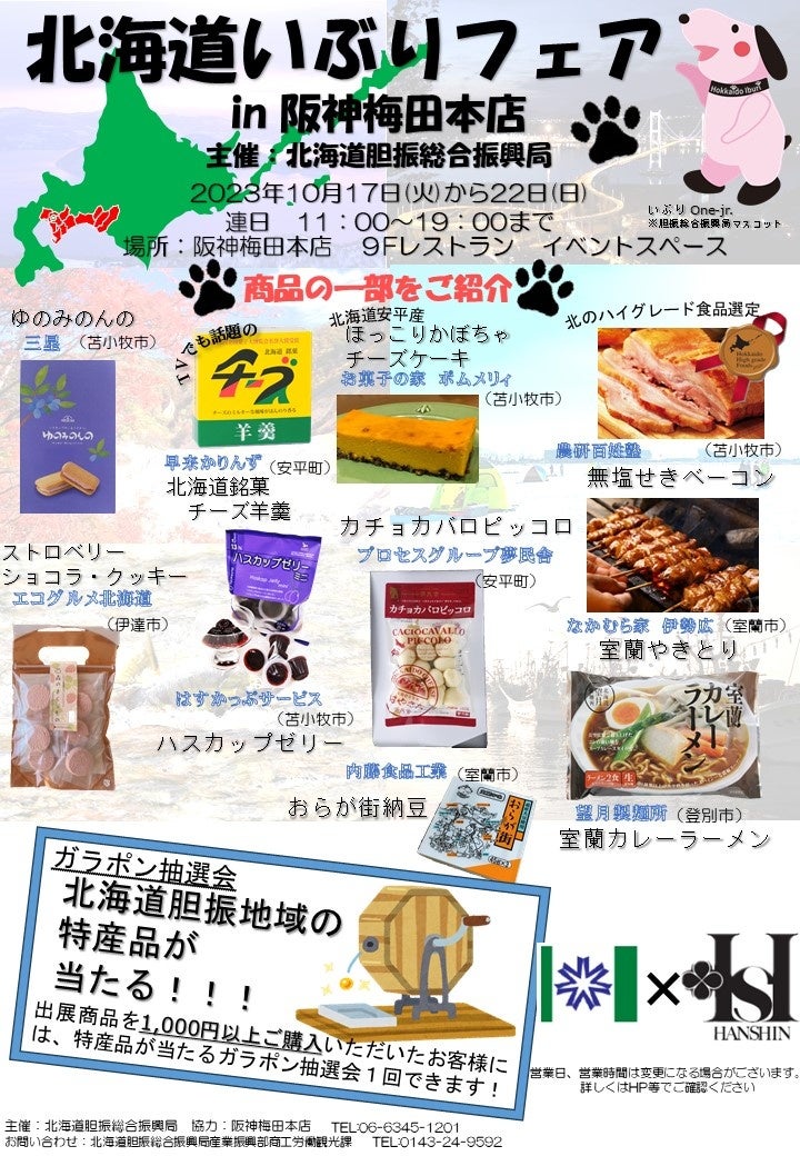 北海道胆振総合振興局では、㈱阪急阪神百貨店 阪神梅田本店の協力のもと、10月17日(火)~22日(日)の6日間、阪神梅田本店で初めて「北海道いぶりフェア」を開催します。