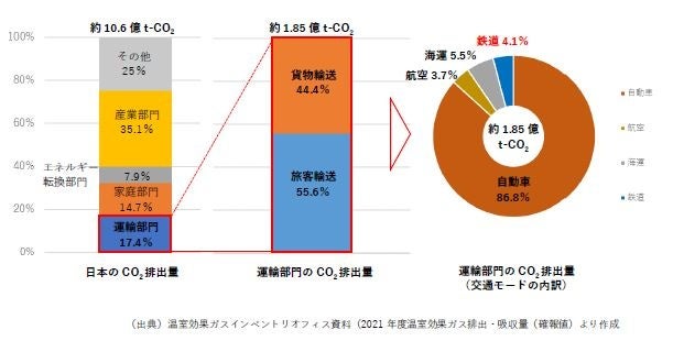 日本のCO2排出量(2021年度 約10.6億t-CO2)のうち、約2割を運輸部門の排出量が占めており、運輸部門におけるCO2排出量の削減は、我が国の2050年カーボンニュートラル実現の重要な構成要素です。