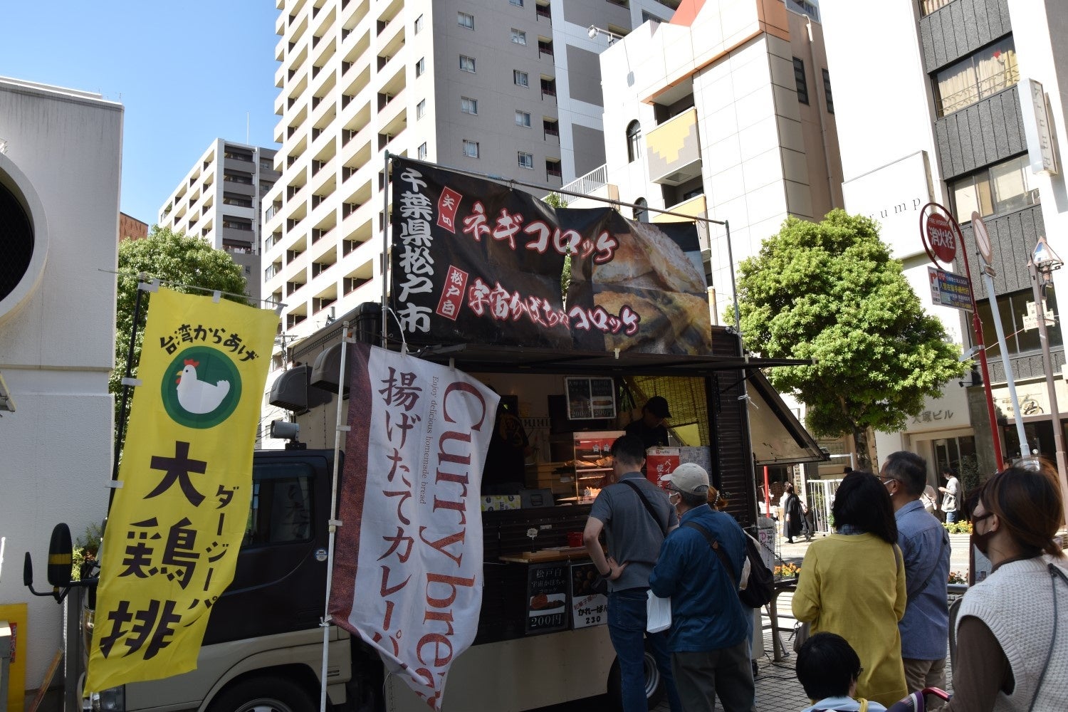 松戸駅東口では「東口おさんぽマーケット」や東口商店街のたくさんの出店が軒を連ねており、多くの人が祭りの雰囲気を楽しんでいました。