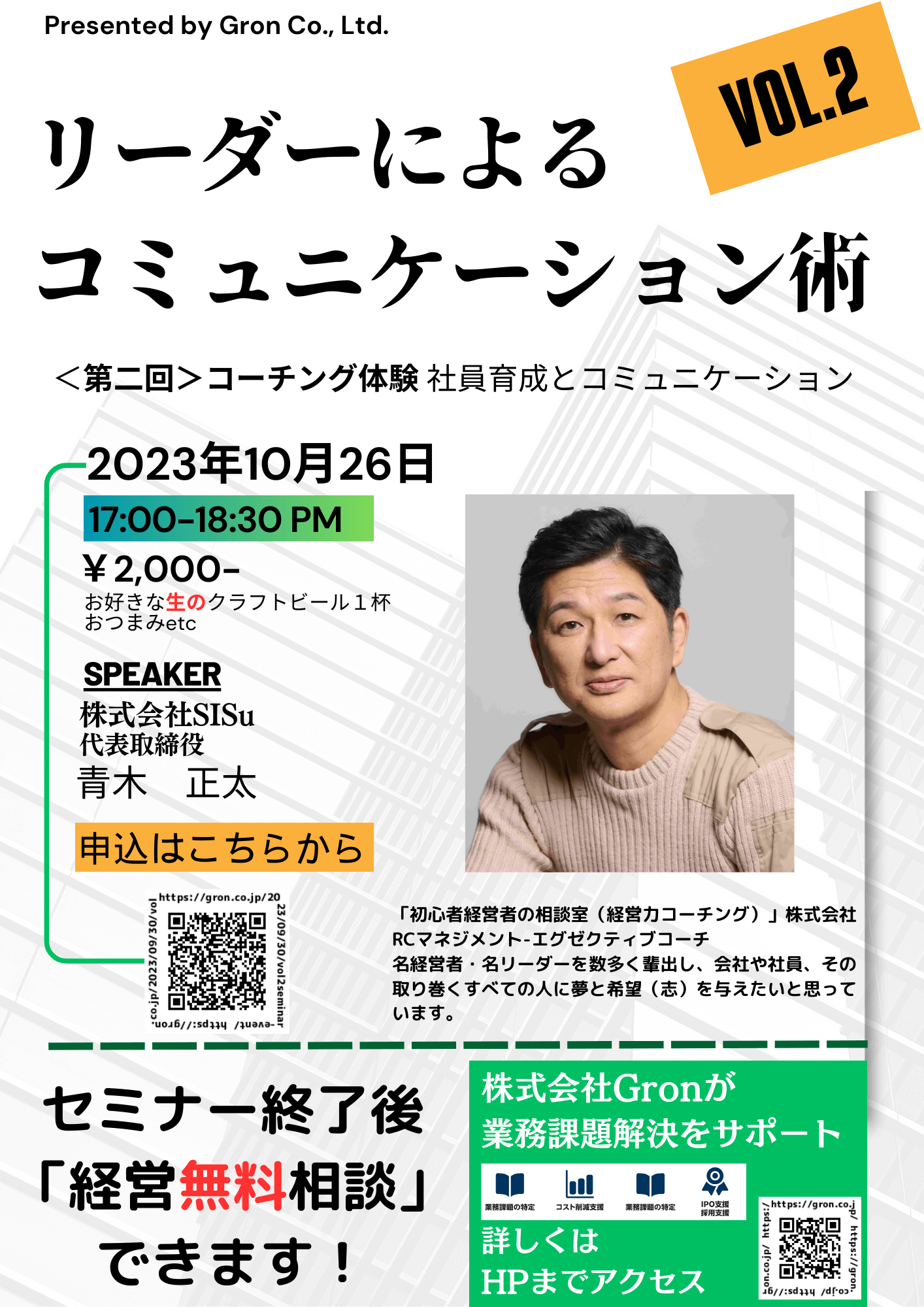 2023年10月26日17:00〜18:30 大阪市西区にある株式会社Gron主催のクラフトビールを飲みながらコーチングを体験しよう第二回目を開催させて頂きます。https://gron.co.jp/2023/09/30/vol2seminar-event/