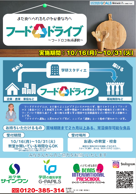 昨年に続き2回目の開催となりました。フードドライブイベントとして実施することで、食料支援だけでなく子どもたちに「食」について考える機会にしたいと考えています。子どもたちへの案内には、食料自給率やフードロス、災害食、「いただきます」「ごちそうさま」の意味など「食」についてのちょっとした豆知識を記載しました。毎日の「食べる」ということに興味関心の気持ちが芽生えてくれたら嬉しいです。また、今年から埼玉県県下一斉フードドライブキャンペーンに参加しています。ぜひ近隣住民の方にもご参加いただきたいと思います。(学研スタディエSGDs推進室 金森裕樹)