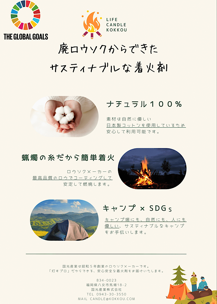 【サスティナブルな着火剤】原料はみんな知ってるアレ・・・ business Twitter Facebook はてブ Pocket LINE コピー 2023.10.16 この記事は約1分で読めます。 廃棄されるローソクから生まれたサスティナブルな着火剤 「燃やしタロウ」 焚き火やバーベーキューをご利用いただけます。 【商品概要】・素材は自然に優しいコットン100%・蝋も国光産業が使用している最高品質のワックス・コットンに蝋を染み込ませているので、簡単に着火できます・耐水性あり。水に濡れても乾かせば着火できます・安心の日本製・動画で使用している丸いもので約5gです。