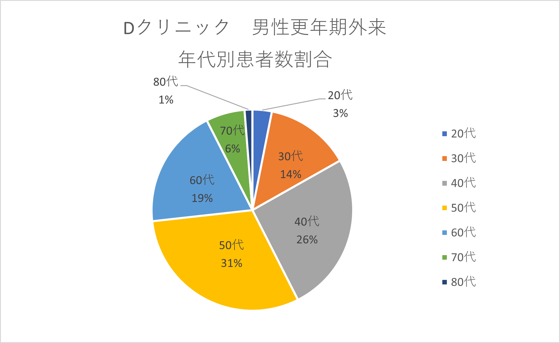 男性更年期外来をもつDクリニックの男性患者様を年代別でみると、閉経前後で比較的年齢割合が固まっている女性に比べ、30代~60代と年齢層も幅広いことがわかりました。