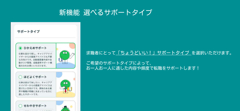 求職者はそれぞれのニーズに合わせて、サポートタイプを選ぶことができます。