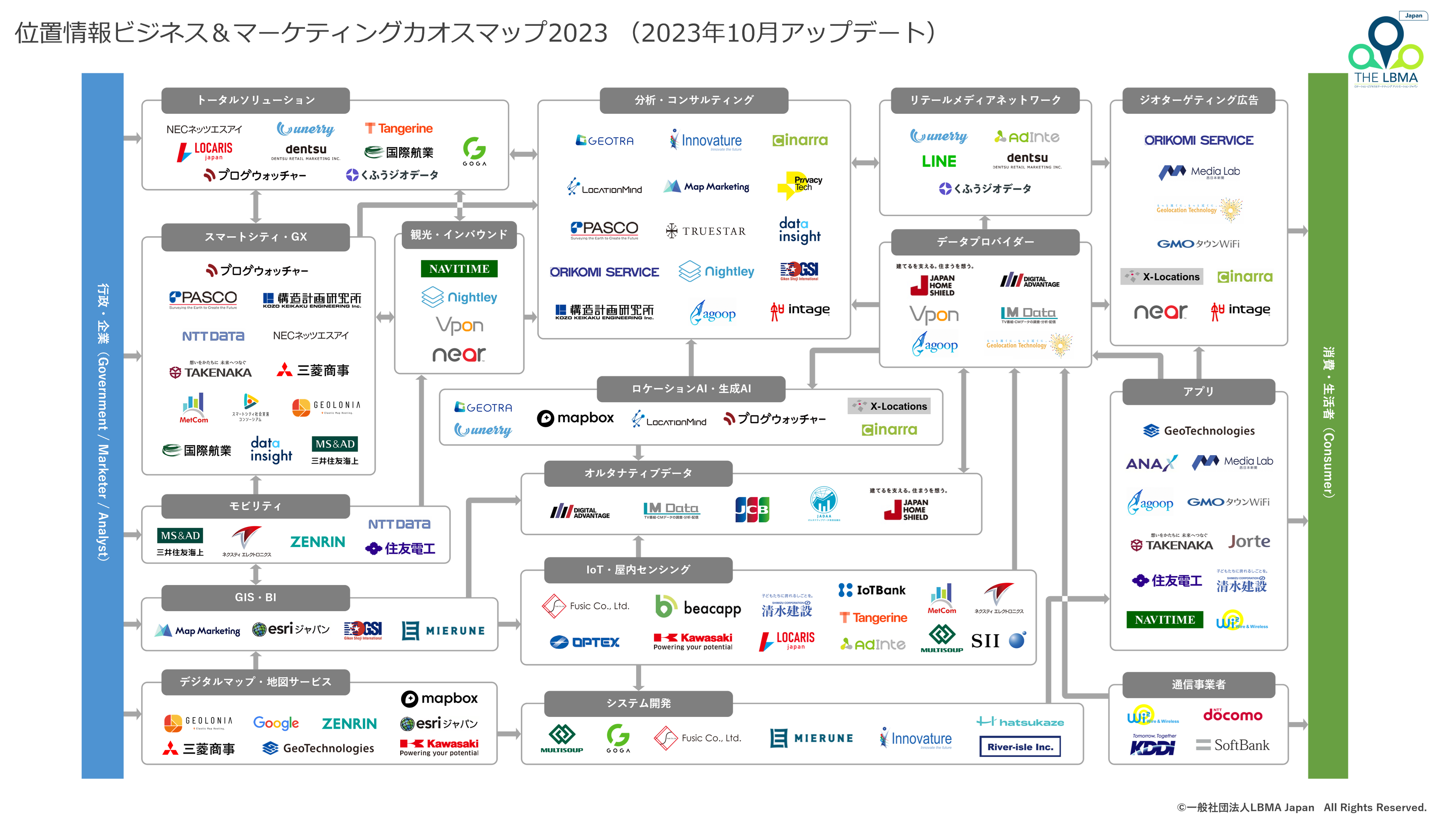 位置情報を活用したマーケティングやサービス施策の促進を目的に活動する65社の企業連合である、一般社団法人LBMA Japan(東京都千代田区/代表理事:川島邦之)は、日本国内に於ける位置情報サービスを展開する企業を中心としたカオスマップの2023年版を作成しましたので、公開致します。