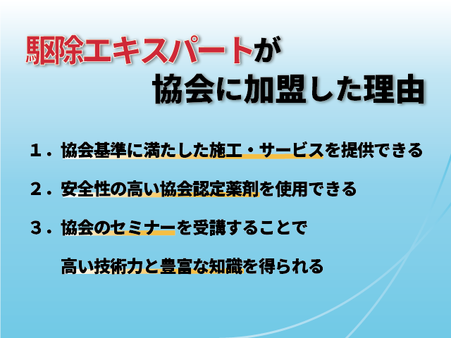 今後も、すべてのお客様に安心してご依頼いただける駆除業者としてサービスを提供できるように、協会の理念に則って取り組んでいきます。