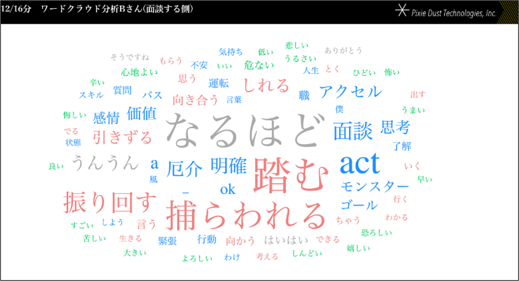 文字の色は青色が名詞、赤色が動詞、緑色が形容詞、灰色が感動詞を表す。