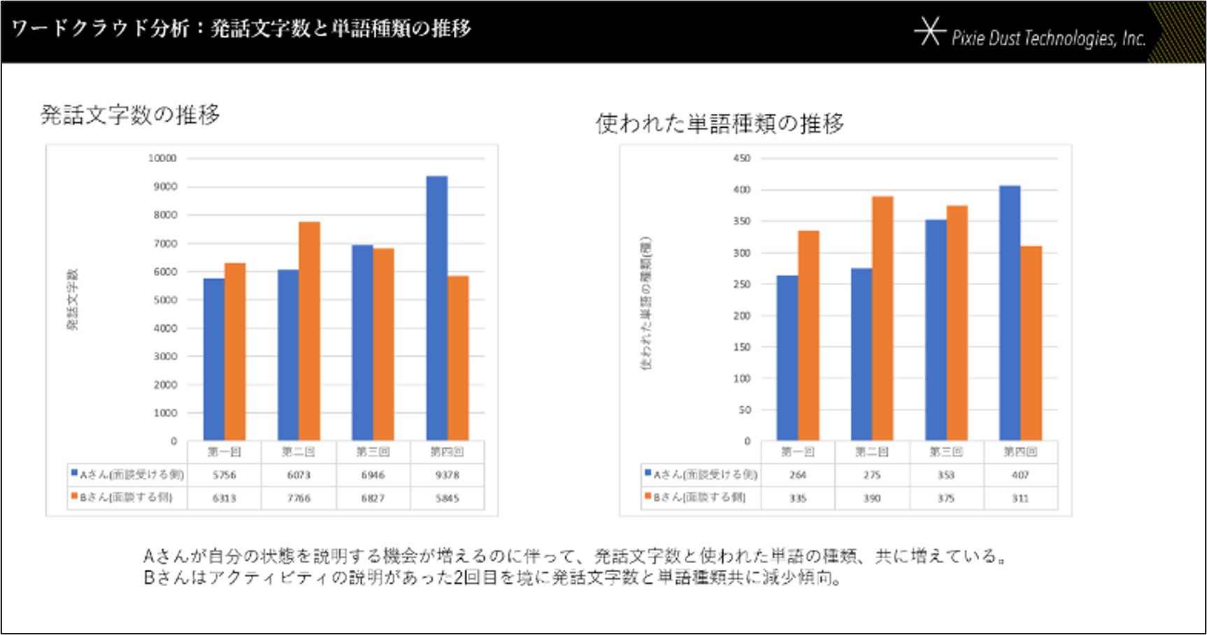 【説明】全4回の面談に対してカウンセラーとクライエントそれぞれの「発話文字数の推移」と「使われた単語種類の推移」をグラフで表示。