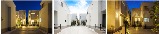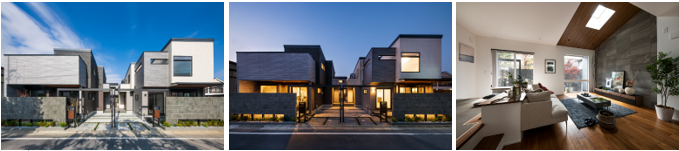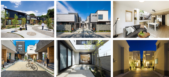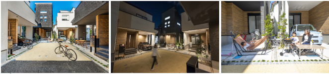都心の分譲住宅における「玄関の位置」と「駐車場の配置」に注目し、安全を考慮して設計した分譲住宅。通常、駐車場として利用される旗竿地のアプローチを4世帯の住民が管理する協定道路とし、協定道路を囲むように玄関とビルトインガレージを隣り合わせに配置しています。住民同士が自然と交流を図れるような外と内を緩やかに繋ぐコミュニティ空間をデザインしました。