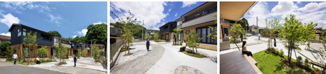 かつて別荘地として志賀直哉らが過ごした我孫子・手賀沼付近に建つ4邸の戸建分譲住宅。その文化的な地域性を表す分譲地とするために意匠を施した協定道路を創出。庭のような道路のような「庭小路」を景観の核とし、そこに面する縁側テラスは住まう人をどこかの別荘に居るような気分にさせます。進む宅地開発と地域文化の薄れる関係を再構築しています。