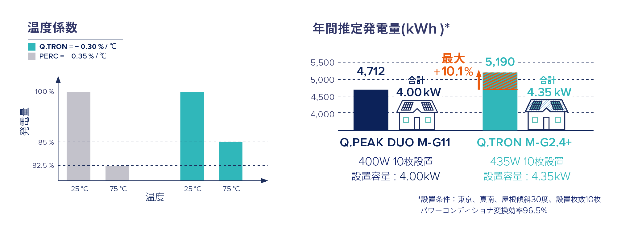 また、太陽電池モジュールは表面温度が上昇すると発電効率が低下しますが、「Q.TRONシリーズ」は発電効率の低下を示す温度係数が自社従来機種の-0.35%/℃から-0.3%/℃に約11%改善され、同じ搭載枚数でより優れた発電力を誇ります。設置方位が真南、設置角度が30度、設置枚数を10枚、パワーコンディショナ変換効率を96.5%と想定した「Q.TRON M-G2.4+シリーズ」の場合、年間推定発電量は従来機種に比べて最大10.1%増加し、限られたスペースでより効率的な発電が可能になりました。