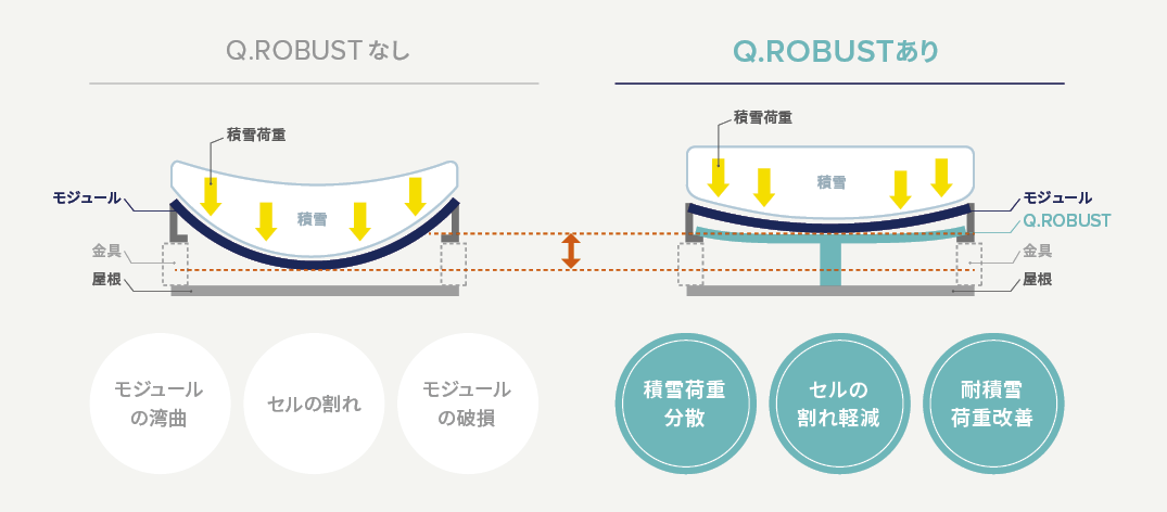 「Q.TRON M-G2.4+」は自社オリジナルの脱着式補強架台「Q.ROBUST®」(キューロバスト)の取り付けが可能です。屋根に穴をあけずに設置する“掴み金具工法”を採用し、屋根にかかる積雪荷重を掴み金具と「Q.ROBUST®」に分散させて降雪による屋根への負担を軽減します。垂直積雪量が210cm(最大)までの多雪地域で設置が可能となり、再生可能エネルギーの普及に貢献します。