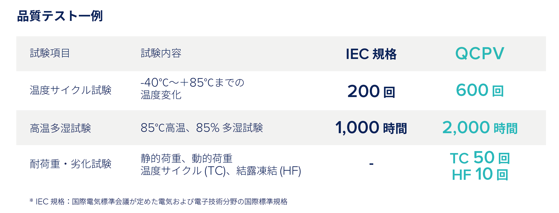 Qセルズは品質管理に厳格な基準を適用し、高い信頼性と耐久性を実現しています。一例として、QセルズはTÜV Rheinland(テュフ・ラインランド)が設計した世界最高レベルの品質検査認証「QCPV」を取得しており、EC規格の最大3倍以上の厳しい試験と専門家によるモニタリングに合格した製品を提供しております。
