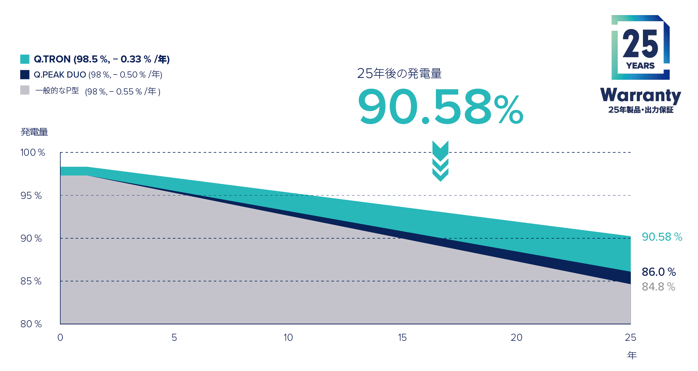 また、長い間安心してご使用いただくため、「Q.TRONシリーズ」では長期間の製品保証と改善された出力保証を提供いたします。自社の従来機種「Q.PEAK DUOシリーズ」の場合、製品保証年数は12年(「Q.SUPREMEシリーズ」を除く)、25年後の出力保証値は86%であるのに対して、「Q.TRONシリーズ」では製品保証年数、出力保証年数ともに25年、出力保証値は90.58%まで向上しました。時間の経過による発電力の低下をより効果的に抑制します。