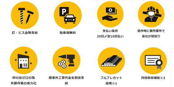 な調整で、無理なく働いていただける環境をご用意しております。年2回の単価アップのチャンスもご用意し、危険な作業をできる限り排除しつつ、万が一のときも手厚い労災保険が大工さんの生活を守ります。