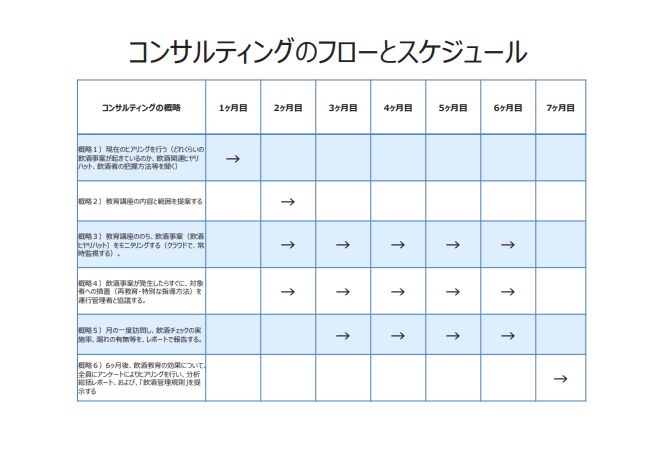 この度当社が認定された教育コンサルメニューは、約半年かけて、AUDITの実施からアルコールの基礎講座や、アルコール検知器のデータ分析、教育資料の維持管理等を、持続性・継続性のある「かたち」として構築を支援する内容です。アルコール検知器をただ使っているだけでは飲酒運転は根絶できないということを、社として定着させるお手伝いを致します。