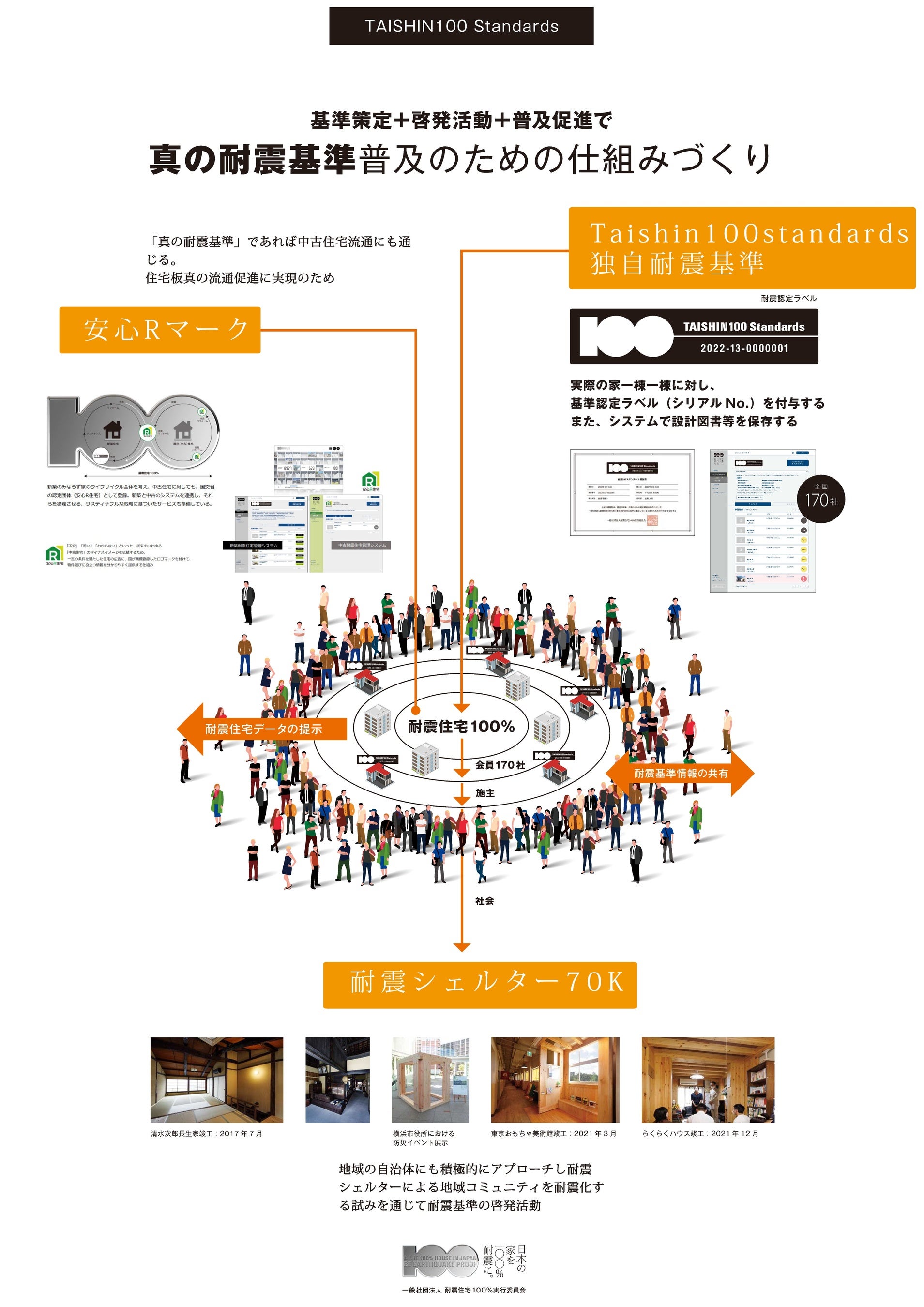 つまり「TAISHIN100 Standards」の認定については、一棟一棟構造計算する必要があり、シリアルNo.付きのラベル発行とともに、多くの設計図書を管理する必要があります。「真の耐震基準」を社会に浸透させていくマーク、そしてそれぞれの家に発行されるラベル、管理用のデータベースシステム。この3つを、住む人、建てる人、管理する人にとって、わかりやすくデザインし、運用することが普及活動にとって重要となり、今後は新築のみならず家のライフサイクル全体を考え、国交省の認定団体(安心R住宅:中古住宅流通促進)として登録。新築と中古のシステムを連携し、それらを循環させる、サスティナブルな戦略に基づいたサービスも検討しています。