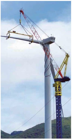 従来のオールテレーンクレーン[※1]の最小作業半径は約22m程度ですが、開発中のタワークレーン「JCW1250」は、12.5mでの作業半径が標準となるため、サイト面積[※2]を削減することができます。また、折り畳み式クロスベース[※3]を採用し、基礎工事が不要となることに加え、風車間移動の際にはクロスベースを分解せずに輸送できる構造となっております。最大吊能力は95トン、最大作業高さは130mとなり、これまでの国内最高風車よりも高く吊り上げが可能となります。