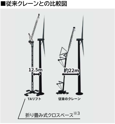 従来のオールテレーンクレーン[※1]の最小作業半径は約22m程度ですが、開発中のタワークレーン「JCW1250」は、12.5mでの作業半径が標準となるため、サイト面積[※2]を削減することができます。また、折り畳み式クロスベース[※3]を採用し、基礎工事が不要となることに加え、風車間移動の際にはクロスベースを分解せずに輸送できる構造となっております。最大吊能力は95トン、最大作業高さは130mとなり、これまでの国内最高風車よりも高く吊り上げが可能となります。