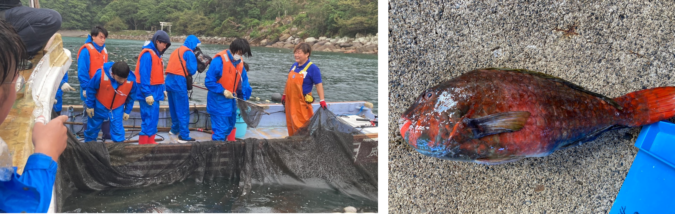 近年、三重県の海域では、黒潮の大蛇行や地球温暖化の影響で、磯焼けの原因である植食性魚類が増加しています。午前中は、雨の降る中、超小型定置網漁を自ら体験して、実際に海でどんなことが起きているのかを観察し、感じてもらいました。慣れない中で、元気よく、網を引き上げました。漁では、植食性の魚(シーベジたべるフィッシュ)であるブダイも獲れました。
