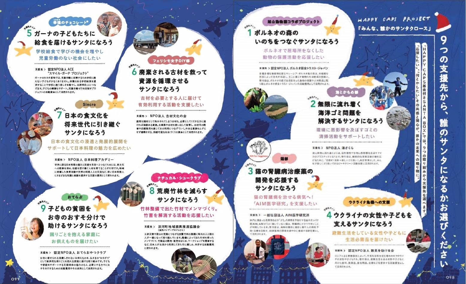 “みんなで「うれしい未来」をつくる!”をコンセプトに、ハッピーキャップスチャリティープロジェクトをはじめ、自然環境の保全や、フェアトレード、伝統技術の継承、困難な状況への支援など30のソーシャルグッドなプロジェクトを紹介しています。