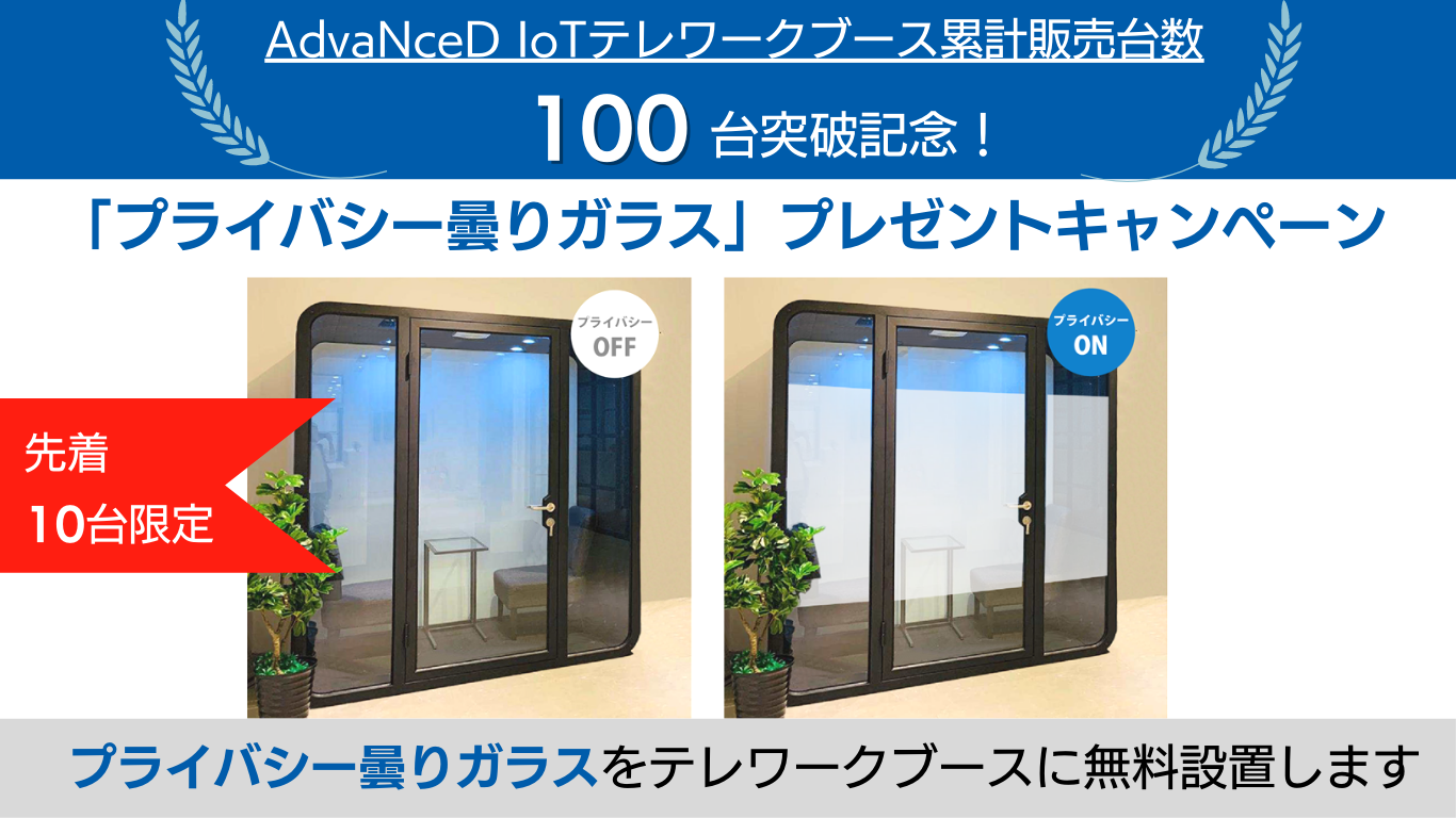 これを記念して、新たに「AdvaNceD IoTテレワークブース」を導入いただいたお客様に、先着10台限定でテレワークブースのオプション「プライバシー曇りガラス」を無料設置させていただきます。