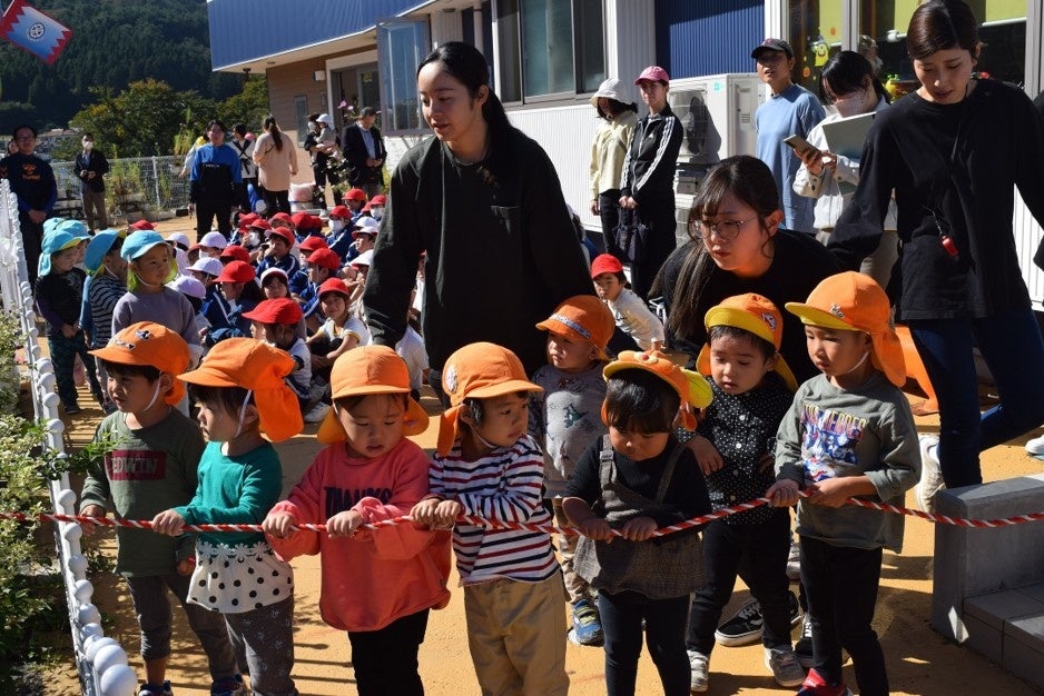 その後、建設中の拠点に移動し「子ども第三の居場所」新拠点の上棟式を行いました。上棟を祝って「餅まき」や子どもたちによる「引き綱」を行い、近隣の皆様にも見守られながら温かい式となりました。また、「子ども第三の居場所」の拠点を運営していく、社会福祉法人堤福祉会の芳賀理事長は、「震災から12年半、地域のつながりも希薄化する中で、『子ども第三の居場所』を拠点とし、子ども、児童、生徒、子育て世代、親を介護する世代、高齢者、介護を受ける世代、多世代をつなぐ環境づくりを目指していきたいと考えています」と、岩手県内初の「子ども第三の居場所」開所に向けた思いを述べました。