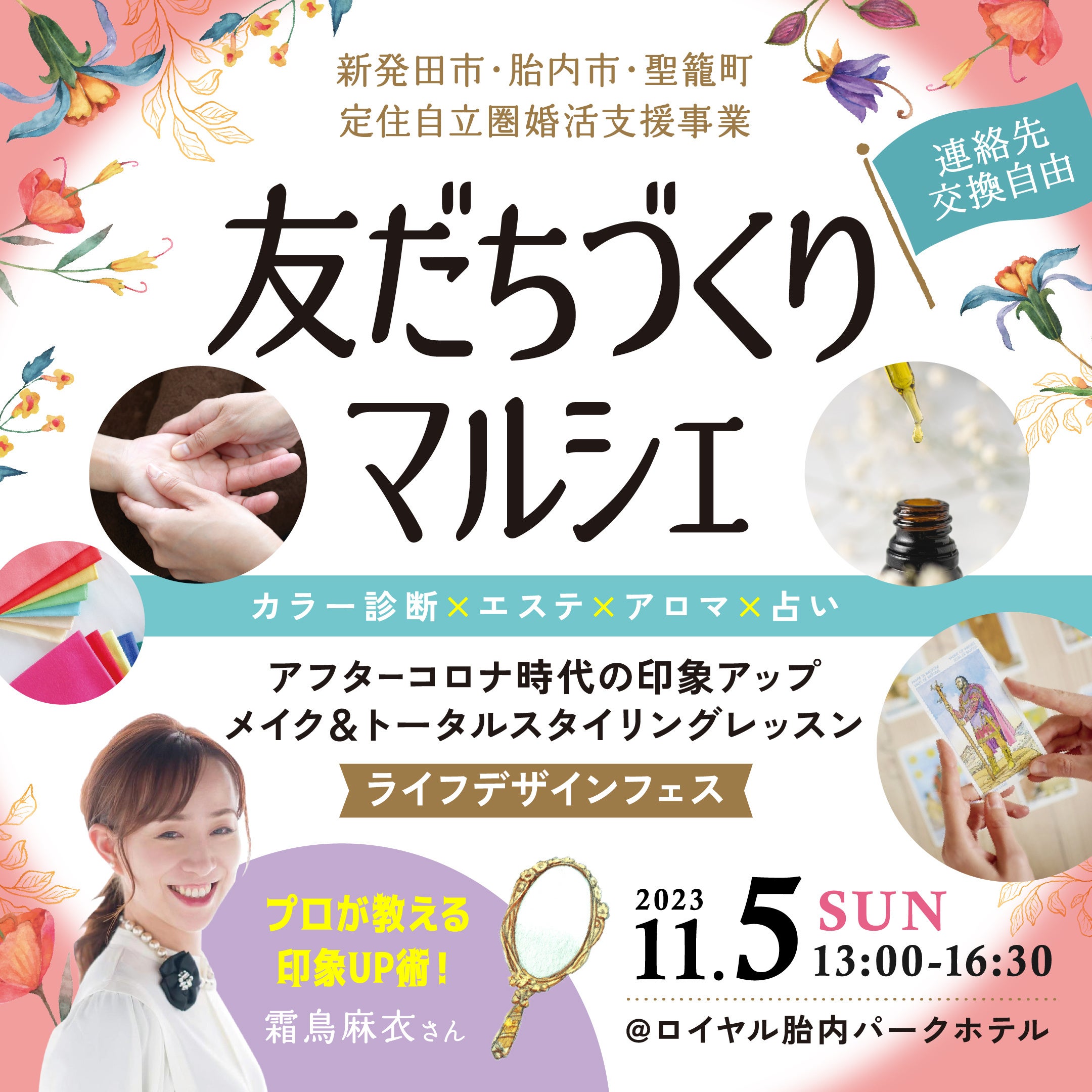14:55 友活マルシェ✖️大交流会(占い、エステ、ミニカラー診断、ワンポイントメイク、スタイリング、アロマワークショップ と盛り沢山!)