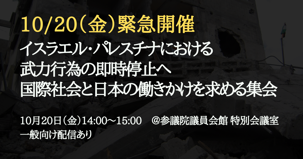 国会議員、メディア、そして市民の皆さまに向け、緊急の院内集会を開催します。多くの市民団体から現場の人々の声をお届けし、暴力の連鎖を止めるため日本が果たすべき役割を考えたいと思います。ぜひご取材ください。