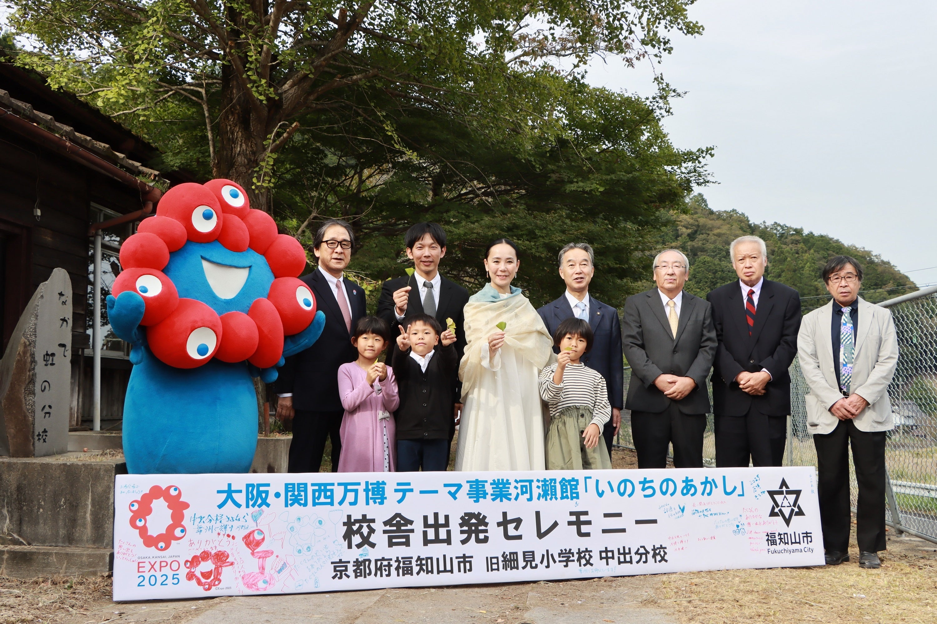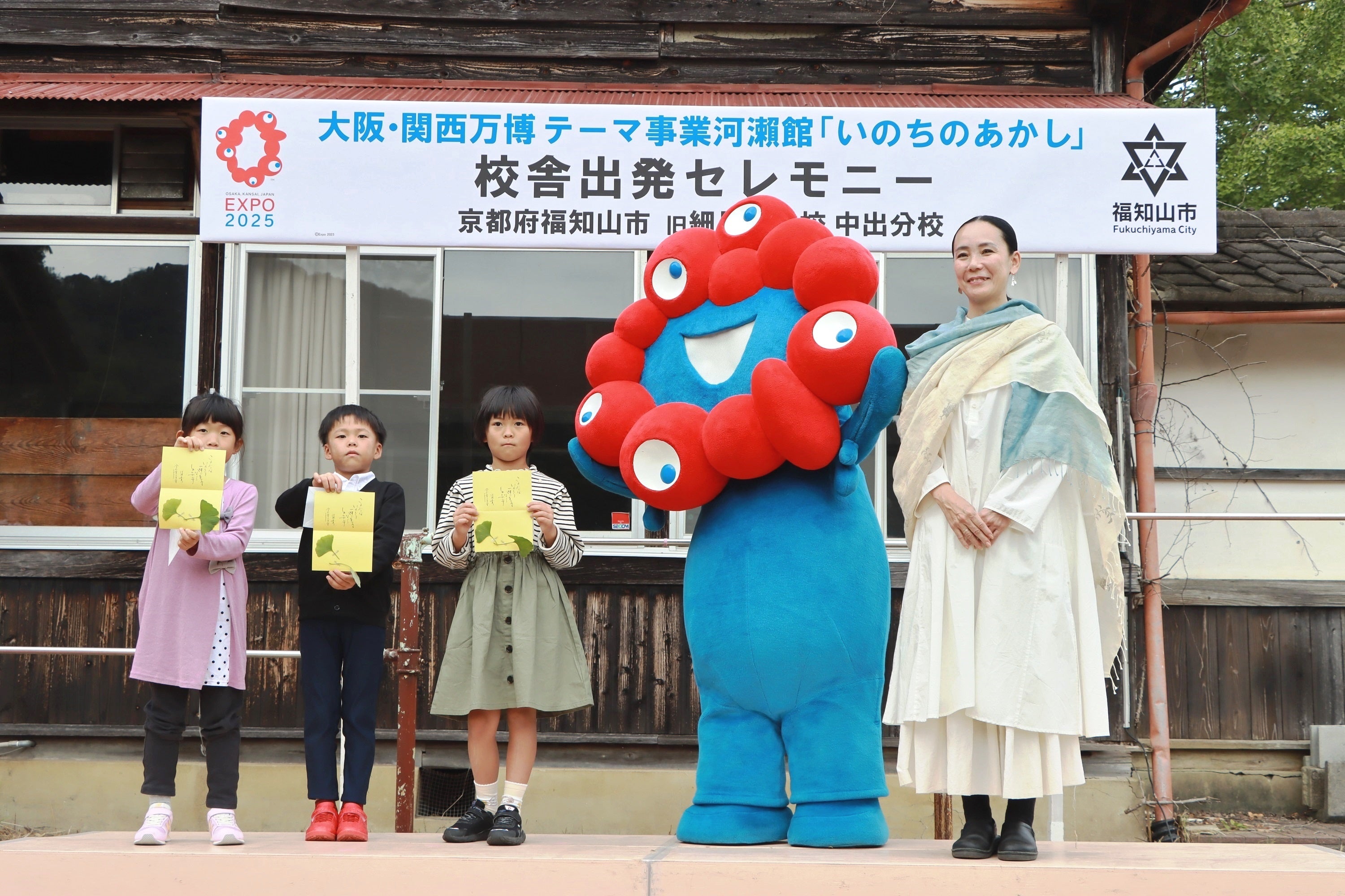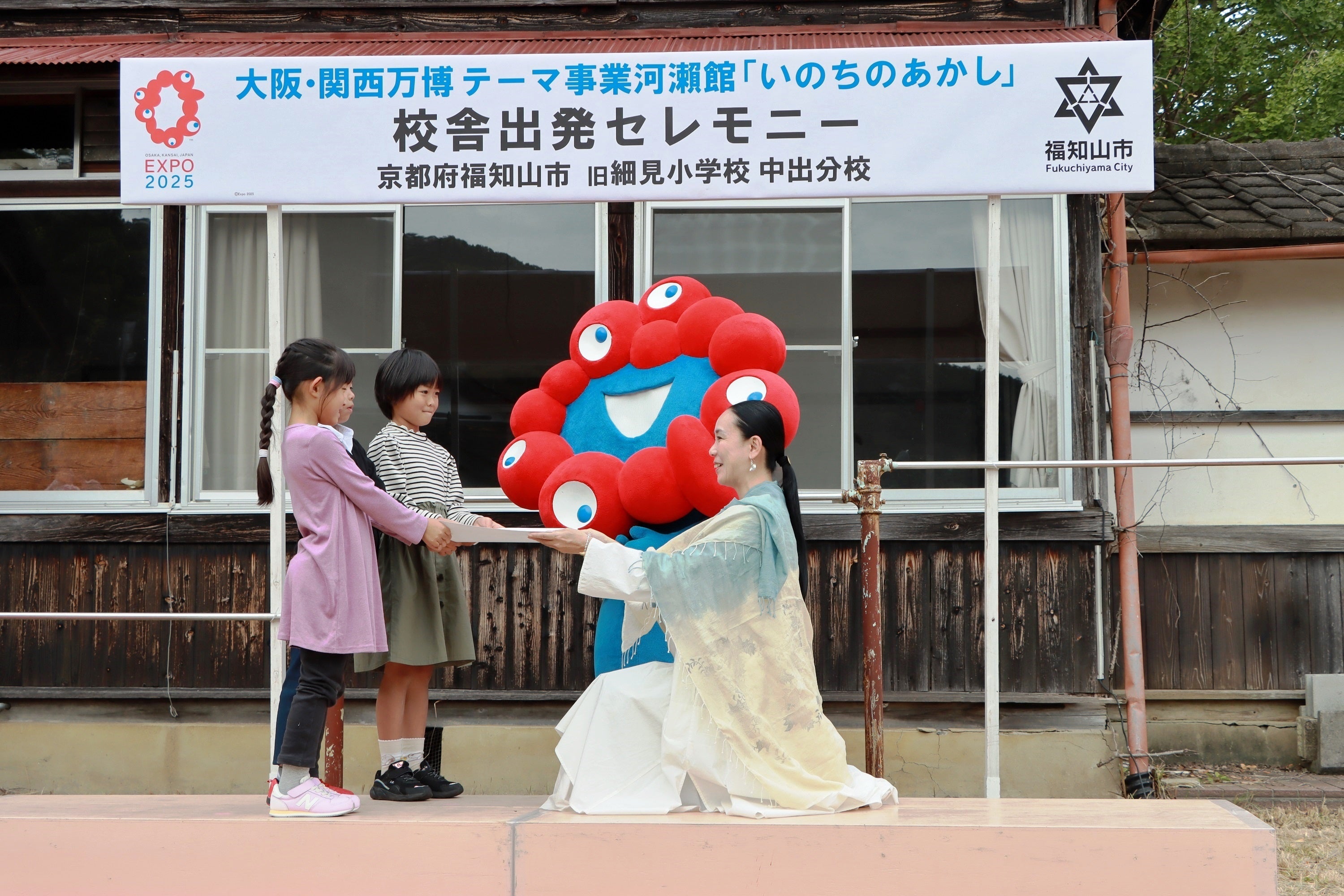 小学校の卒業生や元教師ら地元関係者を前に、福知山市長や大阪・関西万博テーマ事業プロデューサーの河瀨直美さんらがあいさつ。大阪・関西万博公式キャラクターの「ミャクミャク」が見守るなか、中出分校の通学区域に住む子どもたちから、感謝と期待を込めた校舎の「卒業証書」が河瀨プロデューサーに手渡されました。
