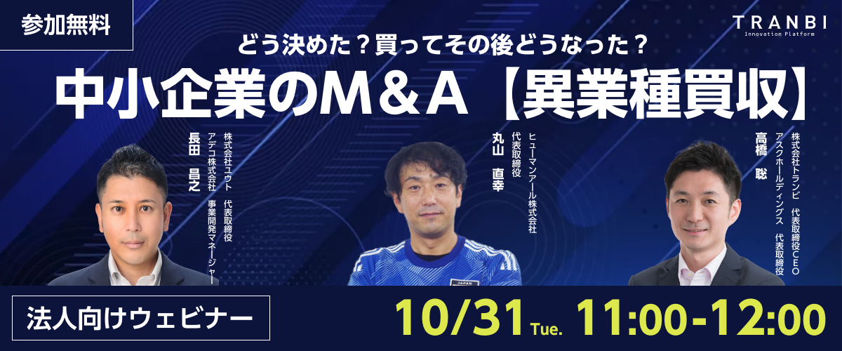 実際にTRANBIを利用したM&Aの体験談、買収後の課題やPMIについて知ることができる機会ですので、ぜひ奮ってご参加ください。