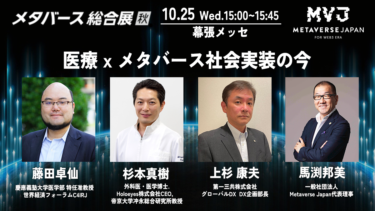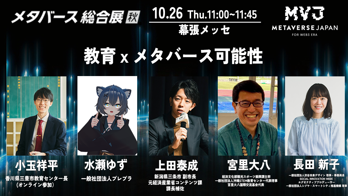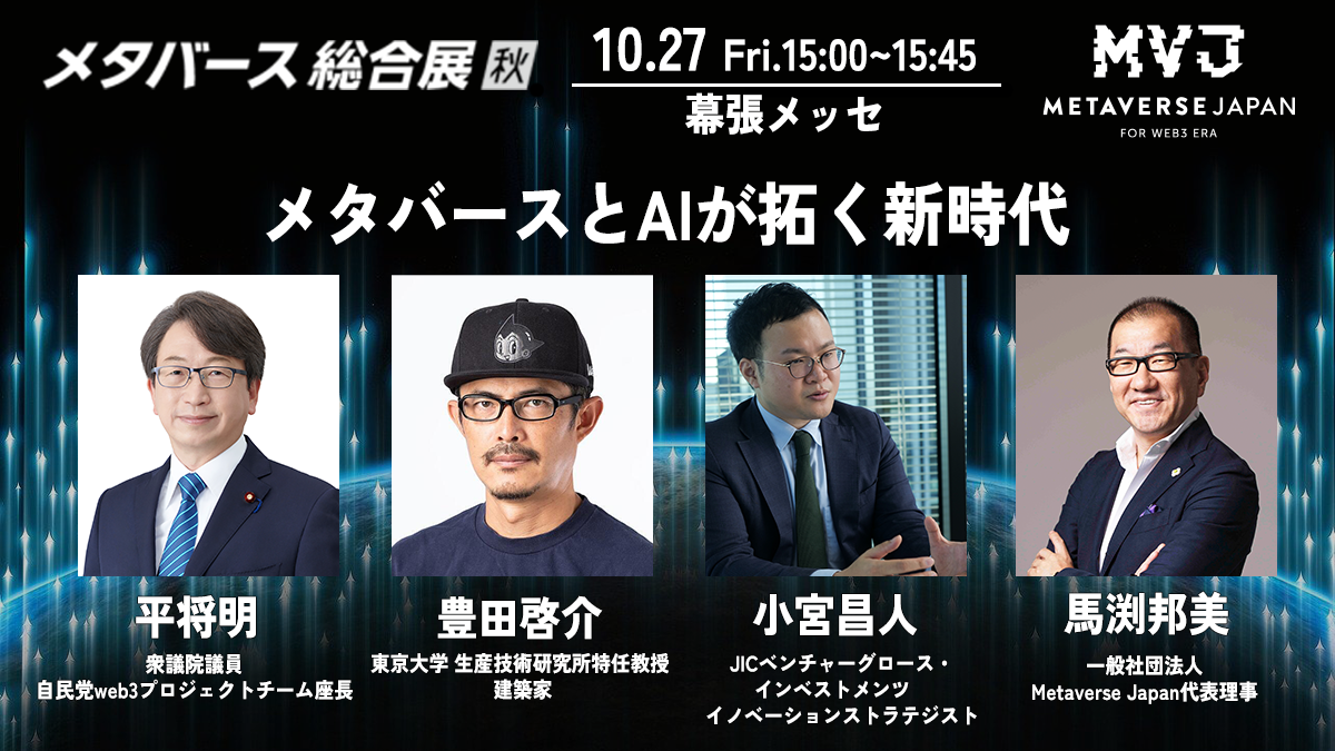 一般社団法人Metaverse Japan (代表理事:長田新子、馬渕邦美、以下Metaverse Japan)は、2023年10月25日(水)から10月27日(金)までの3日間、幕張メッセにて開催される「第2回 メタバース総合展秋」に、代表理事の長田新子、馬渕邦美がアドバイザリーコミッティとして参加し、3つの特別セミナーを実施します。