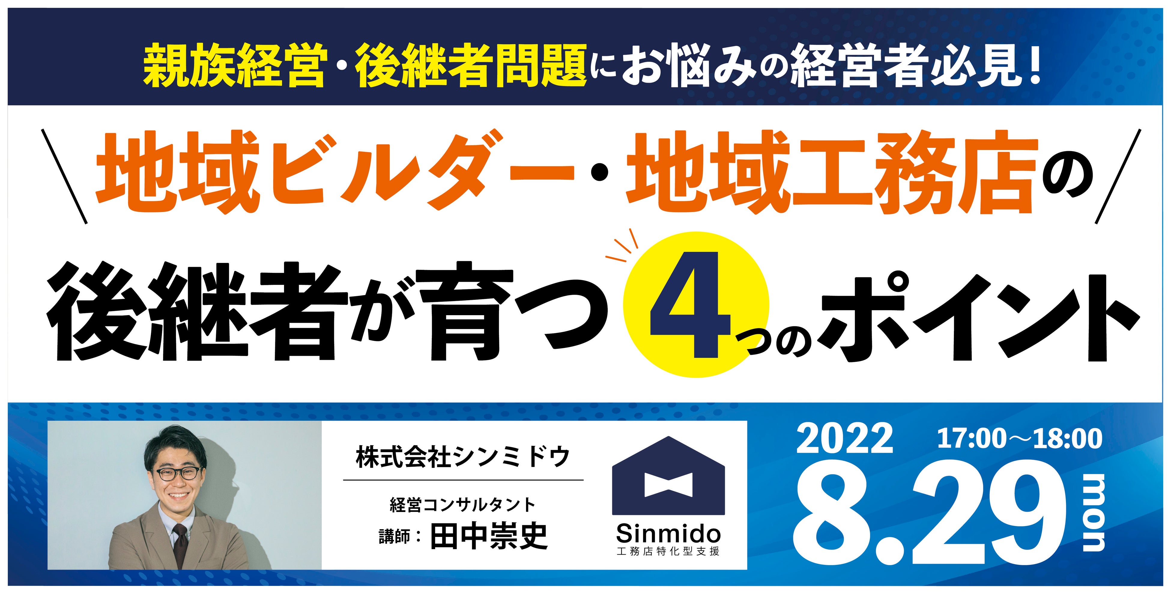 ほとんどの企業が親族経営という形で事業承継をしていく世の中です。本ウェビナーでは、そういった経営者様に対して、【工務店で後継者が育つポイント】を4つに絞ってお伝えします。