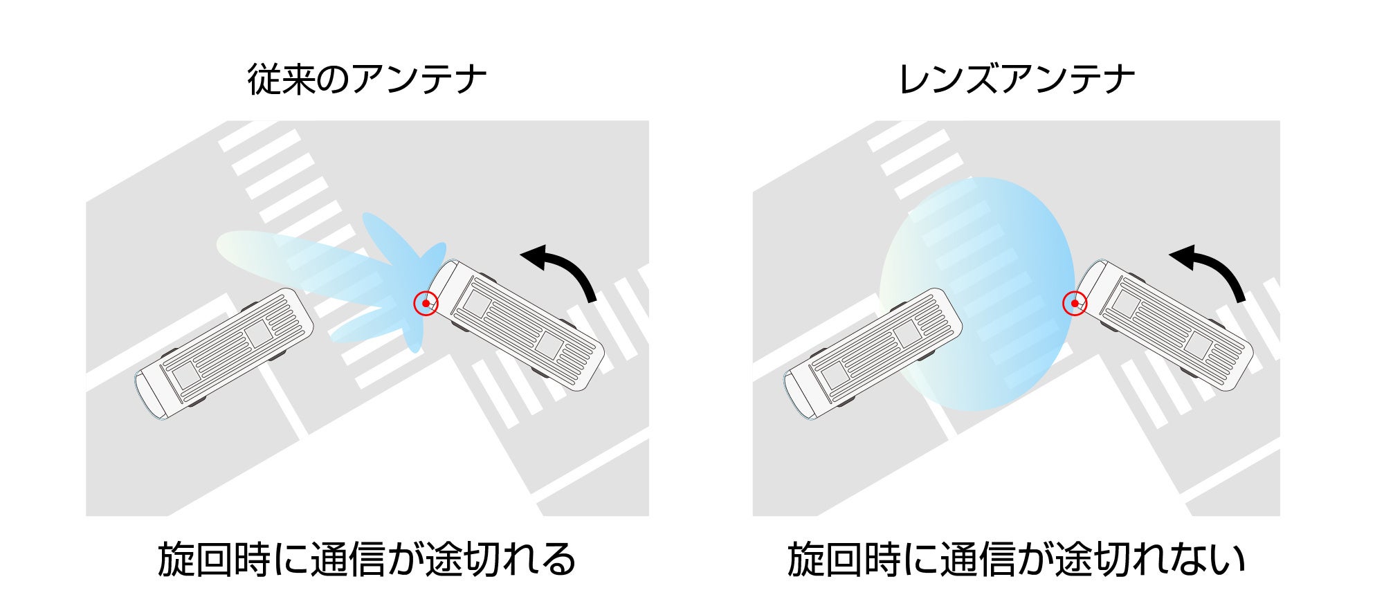本レンズアンテナを使用することにより不要な方向への電波を必要な方向に向けることが可能になり、広範囲で高利得※2(9dBi) かつヌル点※3のないミリ波帯の通信が実現。これにより、旋回時の通信の途切れを防ぎ、隊列走行時にも安定した通信が可能になりました(図3)。