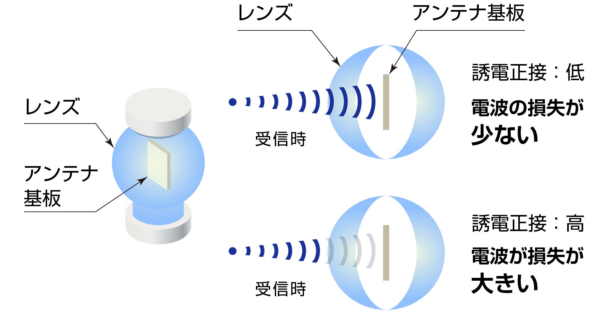 実証実験では、レンズ設計に適した誘電率と低い誘電正接を持つ特殊ガラス材料を使用しました。誘電正接を低くすることで電波の損失を減らすことができ(図1)、またレンズの形状を調整することで、電波を一方向に送ることも、より広範囲に送ることも可能となります(図2)。