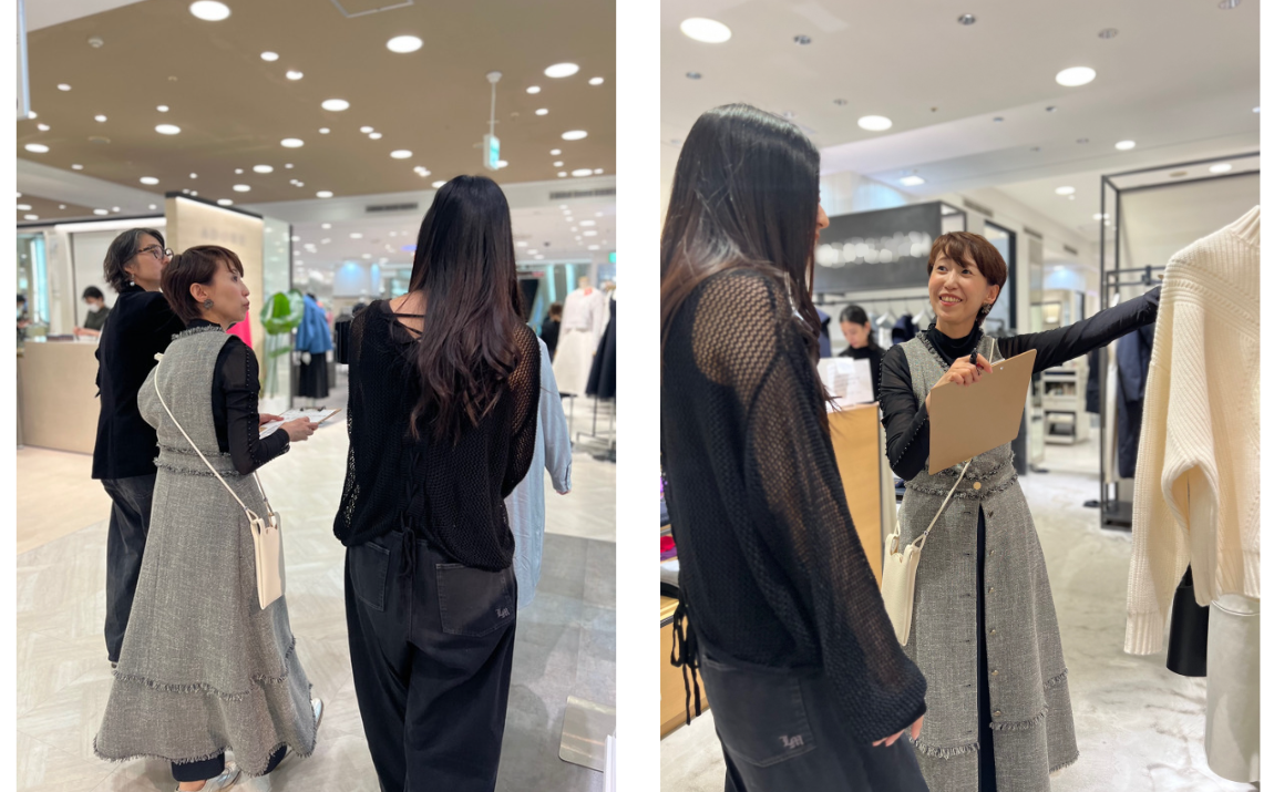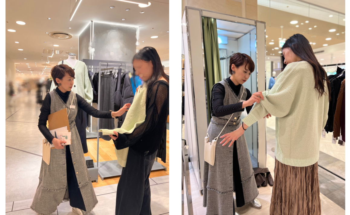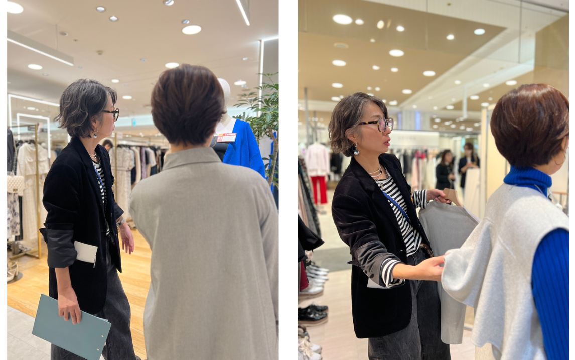 百貨店は敷居が高く感じられて普段は利用しないという30代女性のお客様も、婦人服フロアのお買い物同行で気になる商品をセレクトしてcawaluイベントスペースでまとめて試着できること、ショップを横断してセレクトできることでの新しい発見を体験し、満足度高く複数ショップの商品をご購入されました。