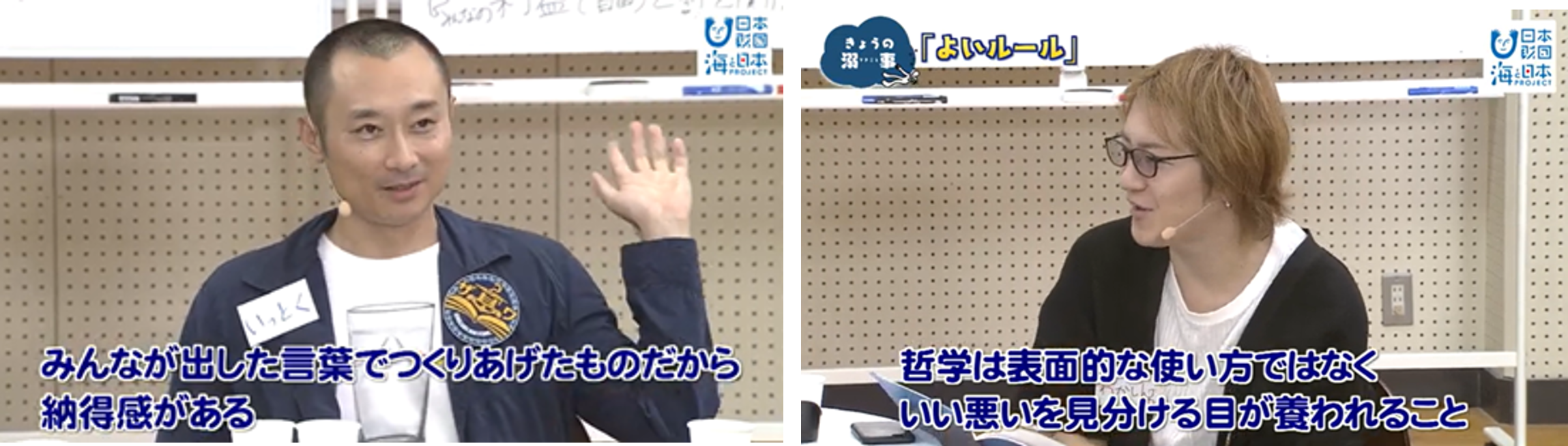 テーマである「よいルール」の本質にたどり着くため、意見を交わした高校生たち。講師の苫野先生からは「それぞれが自分の考える言葉を出して、みんなで作り上げた言葉だから納得できる。これからも考え続けてほしい。」との激励を頂きました。ざわザワ高校の委員長の若新雄純さんからは、「哲学で本質を見つけるざわザワ高校も第4回を迎え、ザワ高生が日ごろから行動や言葉に疑問を持つようになったことは喜ばしい。哲学は表面的な使い方ではなく、良い悪いを自分で見分ける目を養えている。これからも哲学に溺れていこう」との講評がありました。