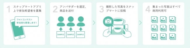 Snapmartアンバサダープランは、Snapmartに写真を投稿・販売しているクリエイターから参加者を募り、開催企業が参加者(アンバサダー)を選定の上、「自社商品のサンプリング」及び、「SNSに馴染むユーザー撮影による写真の大量収集」と「ユーザー体験(クチコミ)の拡散」を依頼することができるサービスです。