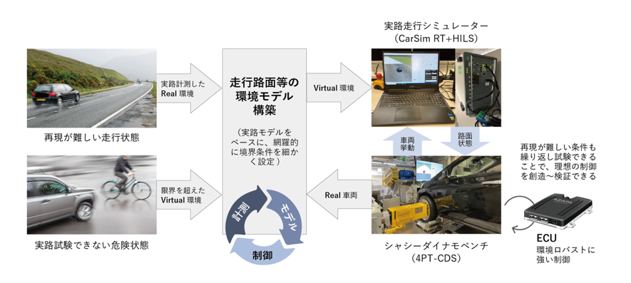 これまで車両評価の台上化は法規制対応を目的としたものが中心でした。今回AZAPAと早大は、現在稼働中の4PT-CDSの特徴を生かしつつ、そこに様々な実路走行環境をシミュレートできるバーチャル走行シミュレーターを連成させることで、台上開発の領域を極限のシーンシチュエーションにおける車両駆動制御のロバスト性検証まで拡張します。